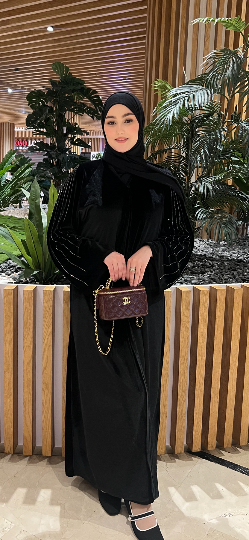 عباية خلود بقماش المخمل مع فصوص في الاكمام و الكتفايدي العباية كلوش يعطيها انطباع الفخامة و الراحة